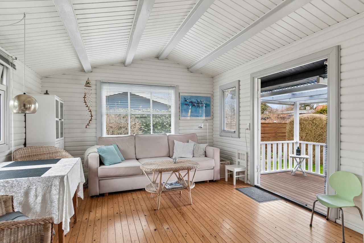 Indendørs mødes du af et lyst og indbydende opholdsrum med loft til kip, synlige bjælker og et fantastisk lysindfald fra de store vinduespartier. Den varme træbeklædning og de lyse farver skaber en rolig og afslappet atmosfære. Stuen er indrettet med både spiseplads og hyggeligt sofahjørne, hvilket gør rummet både funktionelt og hjemligt. Hertil komme et mindre soveværelse samt køkken med det mest fornødne. Toilet og bad er ført til kloak, men ligger i tilstødende bygning til huset.