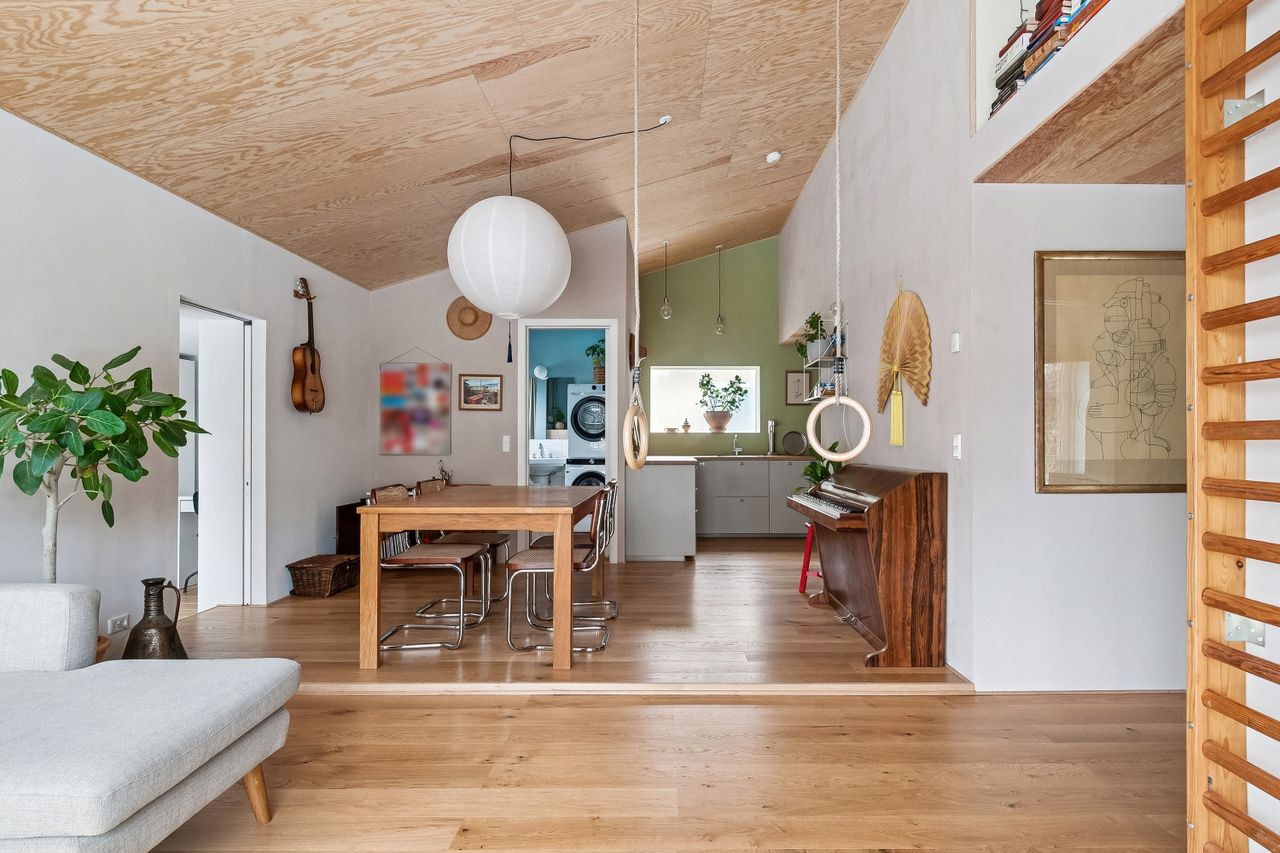 Boligens naturlige samlingspunkt er det åbne køkken-alrum og stue, hvor det høje til loftet og det skønne lysindfald skaber en indbydende ramme om familielivet. I hele den nyere del af huset er der komfortabel gulvvarme via fjernvarme samt smukke egetræsgulve, som giver både varme, kvalitet og et eksklusivt udtryk. Herfra er der direkte adgang til den hyggelige have med flere solrige terrasser, herunder en smuk terrasse belagt med indiske sandsten, senest etableret af sælger – perfekt til lange sommeraftener og udeliv.