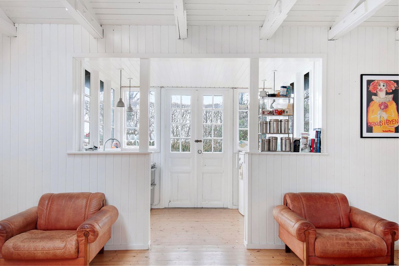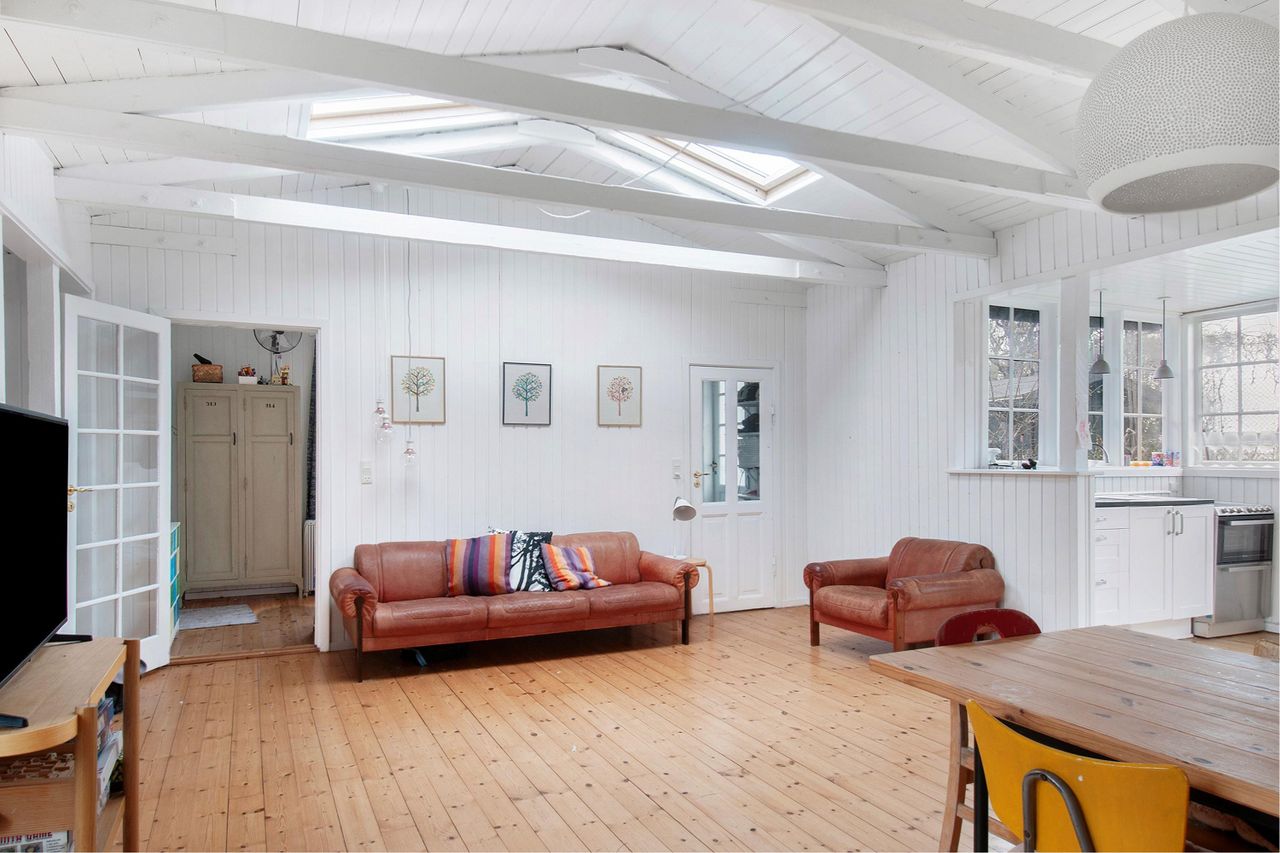 samt en alkove. Her er højt til loftet, godt med lys fra de isatte ovenlys vinduer, og terrassedøre til den