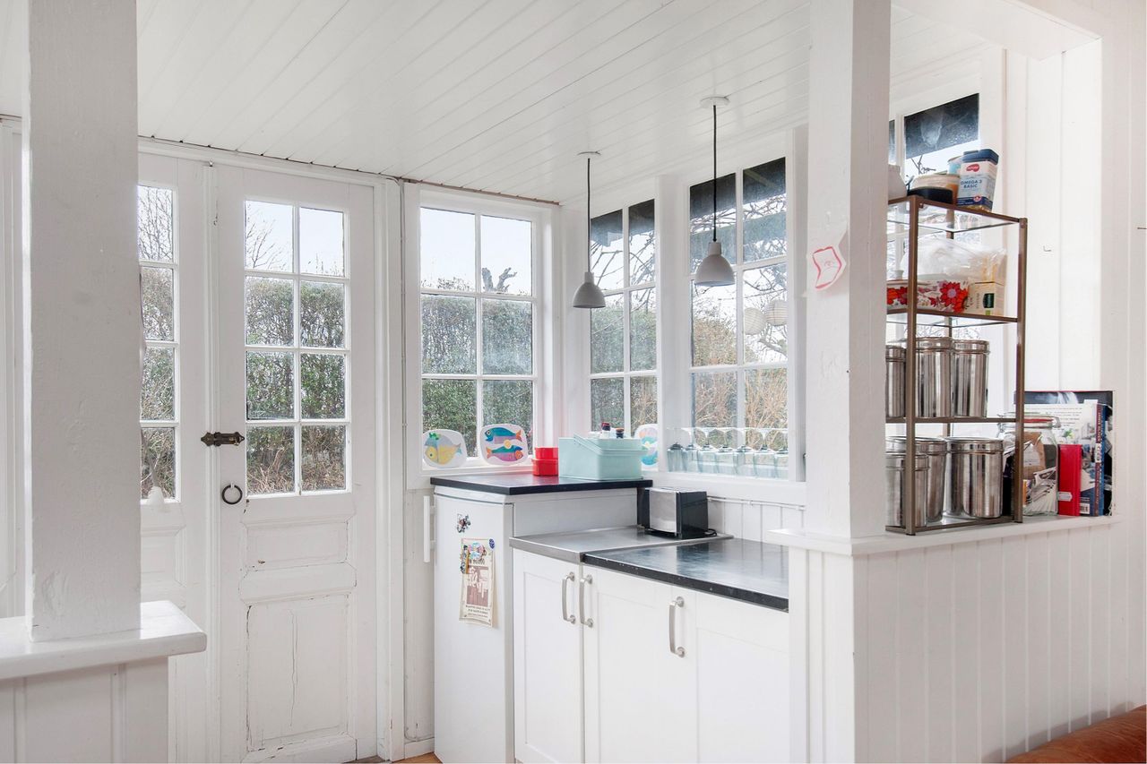 er i klassisk kolonihave stil, insstalleret i lille knopforskydning og med sprossede vinduer hele vejen rundt